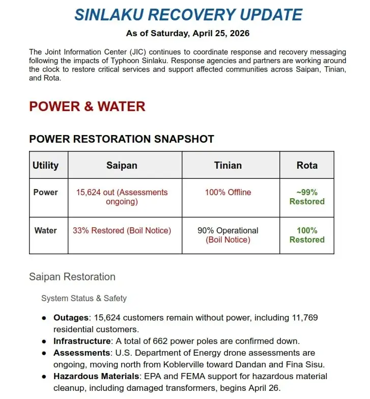 슈퍼 태풍 ‘신라쿠’ 이후 많은 급수 시설이 가동되지 않으면서 주민들의 불만이 고조되는 가운데, 공공 유틸리티 회사(CUC) 측이 과거 태풍 때 사용된 발전기들이 이미 철수했다는 입장을 밝혔습니다. 목요일 열린 특별 이사회에서 CUC 관계자들은 과거 태풍 ‘소델로’와 ‘유투’ 당시 설치되었던 발전기들은 연방재난관리청(FEMA)의 임시 자산이었으며, 복구 작업이 끝난 후 모두 회수되었다고 설명했습니다. 베티 … CUC, 태풍 후 발전기 임대 논란에 “임시 자산이었다” 해명Read more