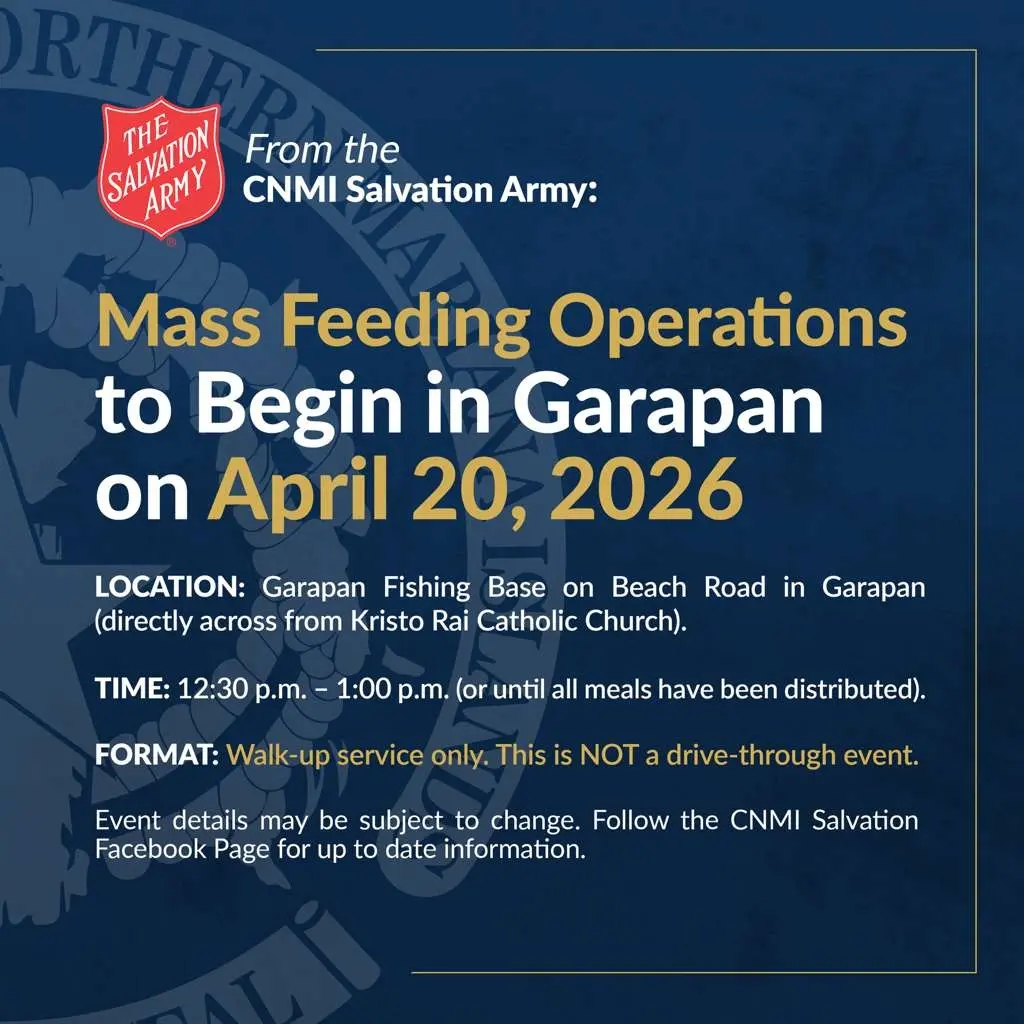최근 발생한 정전 사태로 어려움을 겪고 있는 주민들을 위해 가라판 지역에서 긴급 급식 지원이 시작된다. 국토안보비상관리국(HSEM)은 구세군과 협력하여 오는 4월 20일 월요일부터 가라판 낚시터(Garapan Fishing Base)에서 따뜻한 식사를 제공한다고 밝혔다. 현장 배급은 오후 12시 30분부터 1시까지 진행되며, 준비된 식사가 소진될 경우 조기 종료될 수 있다. 이번 급식은 차량을 이용한 드라이브스루 … 가라판 지역, 4월 20일부터 긴급 급식 지원 실시Read more