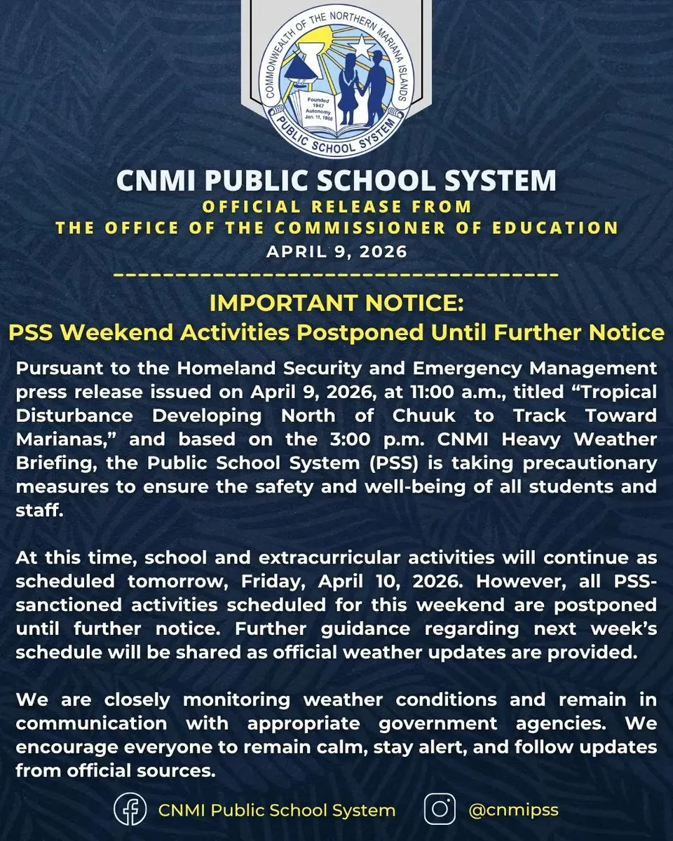 북마리아나 제도의 공공교육 시스템(PSS)이 현재 개발 중인 열대성 저기압으로 인해 이번 주말 예정되었던 모든 활동을 잠정 연기한다고 9일 발표했습니다. 이는 같은 날 오전 11시에 발표된 국토안보비상관리국의 “추크 북쪽에서 발달하는 열대성 저기압, 마리아나 제도 향해 추적 중”이라는 보도자료와 오후 3시 CNMI 중량 기상 브리핑에 따른 조치입니다. PSS는 학생과 교직원의 안전과 복지를 … 북마리아나 공공교육 시스템, 주말 활동 잠정 연기Read more